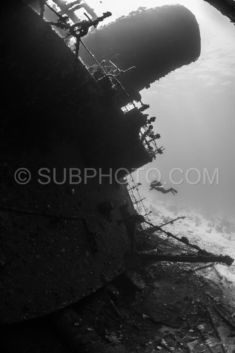 A diver- using a rebreather- swims along the side of a shipwreck in the Red Sea. The diver is silhouetted against the sunlight- making their figure dark against the lighter background.
