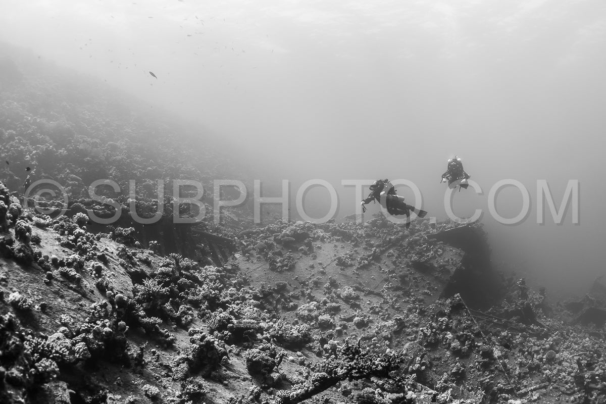 Two divers- using rebreathers- are exploring a coral reef in the Red Sea. The divers are moving past a rocky outcropping and are surrounded by a dense layer of coral.